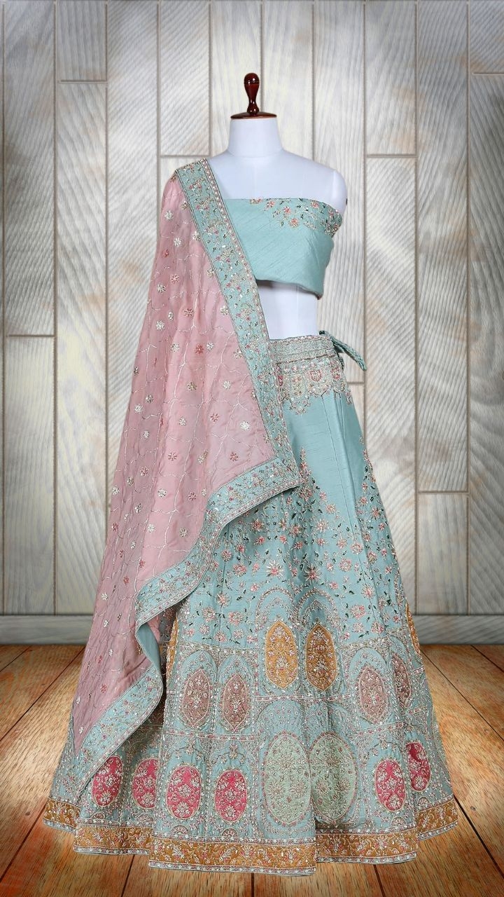 Enhance your bridal look with our stylish mint green unstitched lehenga choli. Designed in premium raw silk fabric, it features exquisite details including beads, cutdana, resham, zari, and sequins work. The ensemble is complemented by a contrasting color dupatta, adding a touch of vibrancy to your attire. Crafted to perfection, this trendy lehenga choli is a perfect choice for the modern bride. Get ready to turn heads and make a statement on your special day. Shop now to complete your bridal ensemble with this stunning piece.