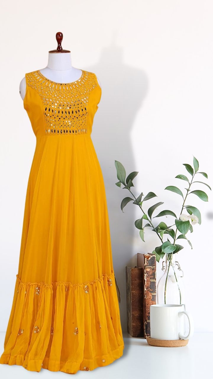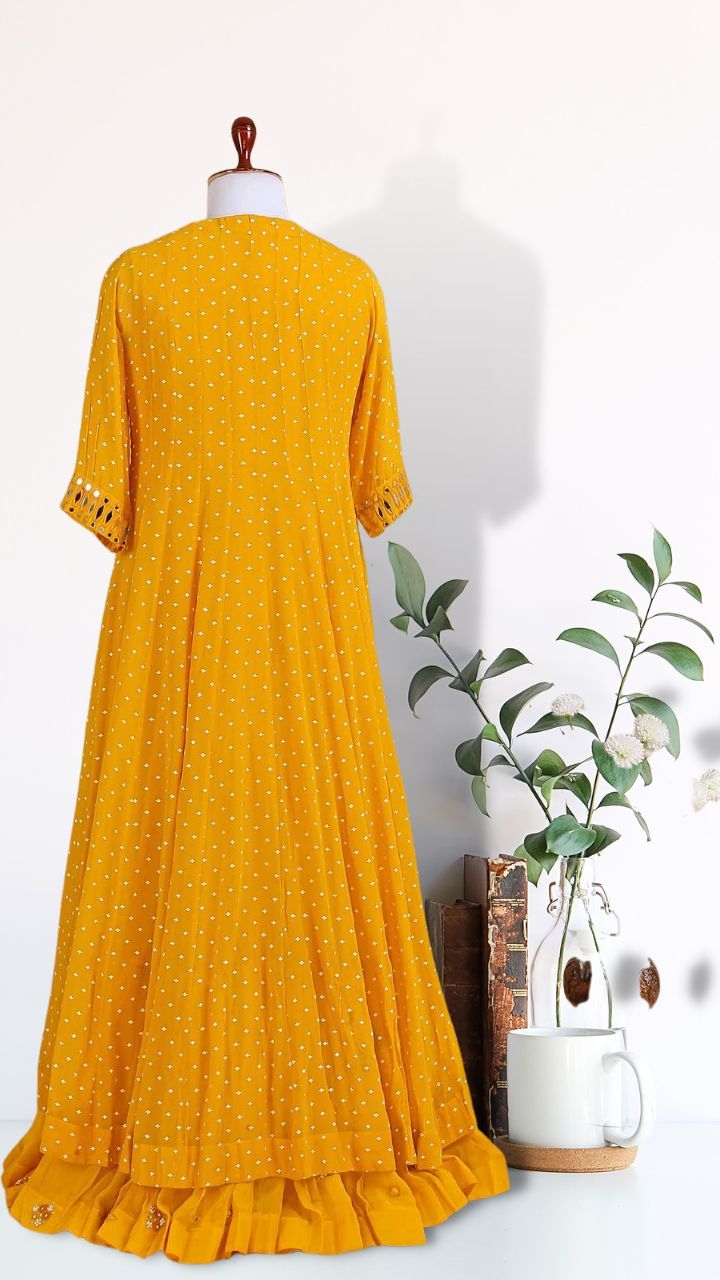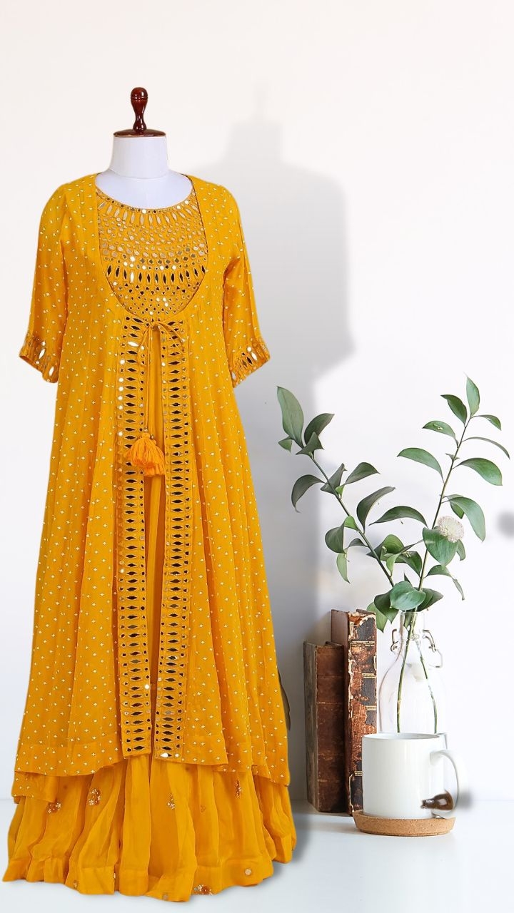 Revamp your ethnic wardrobe with this trendy yellow georgette jacket style floor length suit. Designed to perfection, it adds a stylish flair to your ensemble. The unique craftsmanship of mirror and resham work enhances its charm, while the round neck and sleeveless pattern exude elegance. Completing the look is a full-sleeve printed shrug, adding an extra touch of sophistication. Embrace the beauty of this ensemble and make a fashion statement at any occasion. Upgrade your ethnic attire with this exquisite piece. Shop now and elevate your style game with this stunning georgette jacket suit.