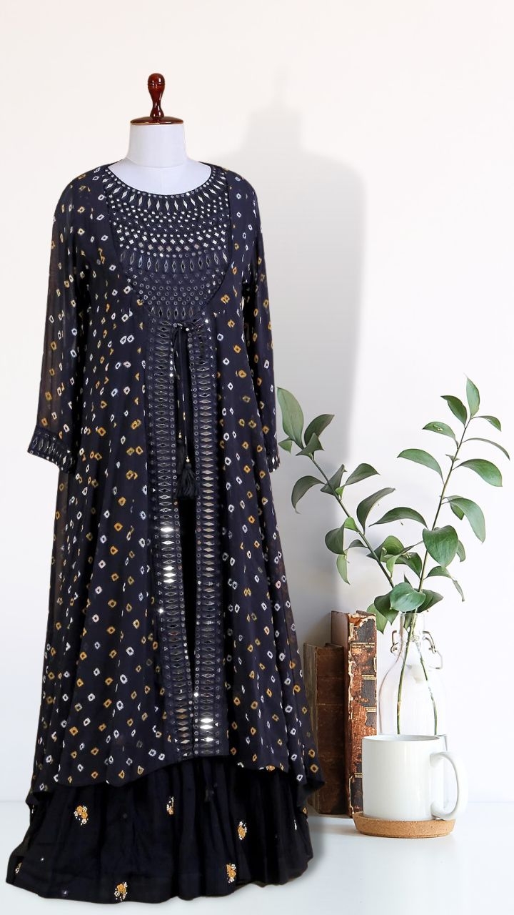 Elevate your style quotient with our exquisite navy georgette jacket style floor length suit, a perfect blend of tradition and ethnicity. Crafted with love and pride, this ensemble is adorned with intricate mirror and resham work, adding a touch of opulence. The round neck and sleeveless pattern enhance your grace and make you sparkle at any event. Complete with a full-sleeve printed shrug, this suit is a true fashion statement. Embrace the beauty and elegance of this ensemble and be the center of attention. Shop now and step into the limelight with this stunning georgette jacket suit.