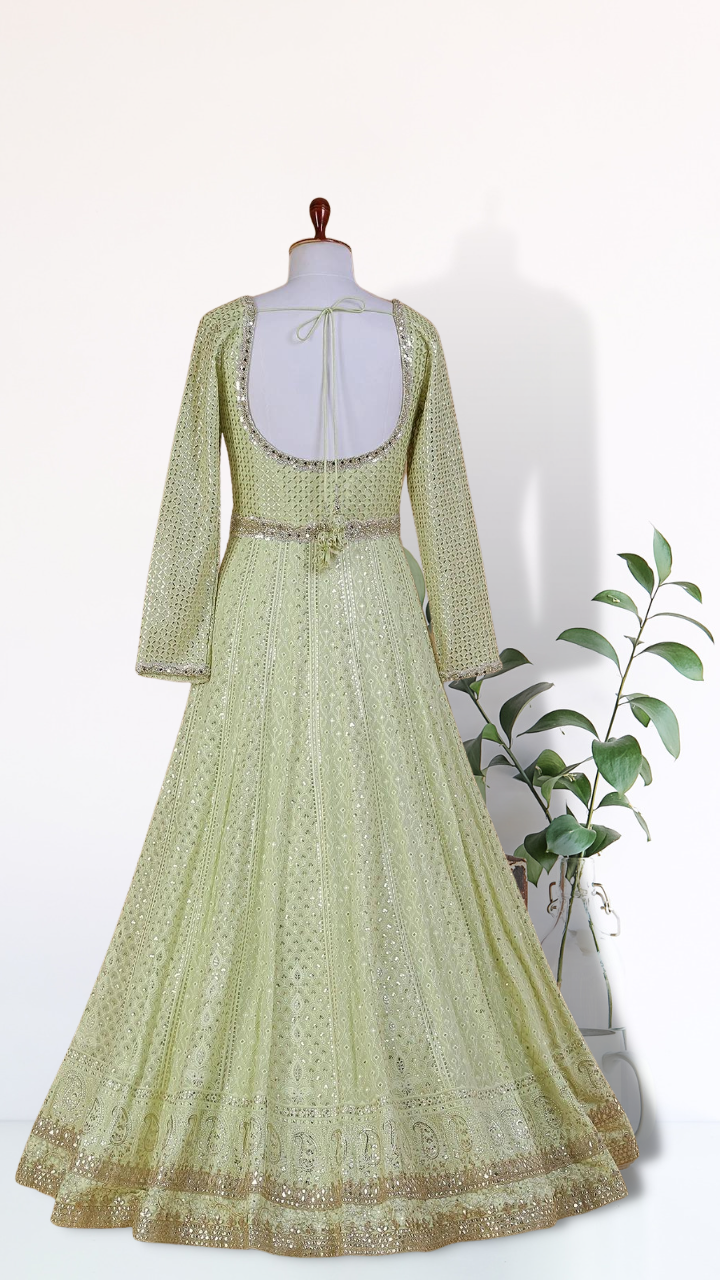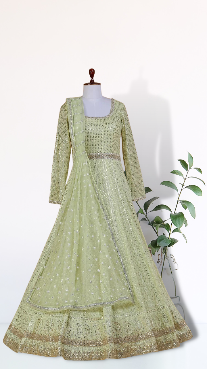 Step into the limelight at your next event with our stunning light green anarkali suit adorned with a dupatta. Crafted with finesse in georgette fabric, this ensemble features exquisite lucknowi, zari, sequins, zardosi, and mirror work at the bodice, adding a touch of sparkle and allure. The U neck and full sleeves enhance its elegance, making it perfect for weddings and special occasions. Be prepared to receive a shower of compliments as you gracefully don this ensemble. Shop now and make a captivating impression with this sparkling light green anarkali suit.